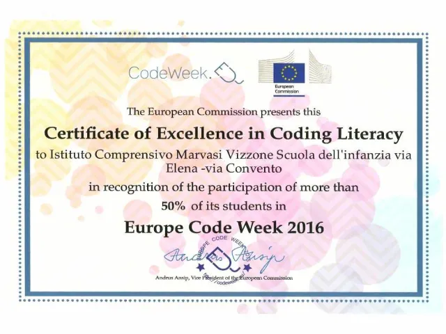 Il Certificato di Eccellenza in Coding Literacy, frutto della determinazione e della grande partecipazione nei confronti della EuCodeWeek4AllChallenge è finalmente arrivato. Un certificato a firma della Commissione Europea nel nome del vice presidente Andrus Ansip, che da merito alle scuole che si sono distinte nella diffusione del Coding.
