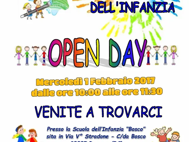 Mercoledì 1 Febbraio 2017 la Scuola dell’Infanzia “Bosco” ha aperto le porte per mostrare all’esterno ed in particolare ai genitori di bimbi di 3 anni come gli alunni imparano a stare insieme e ad utilizzare e sviluppare le proprie capacità di apprendimento e le proprie competenze.