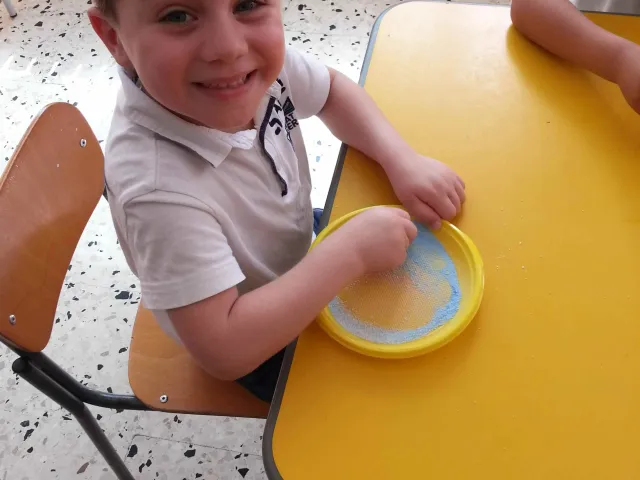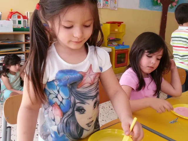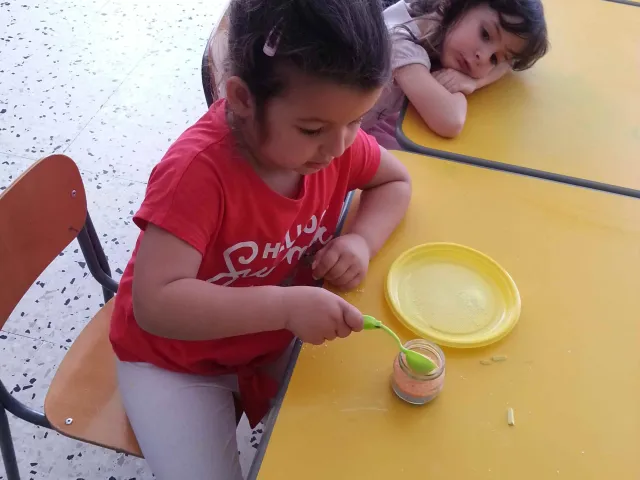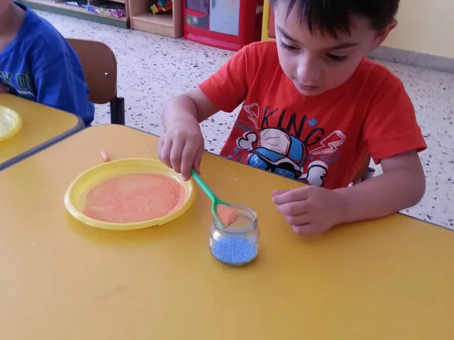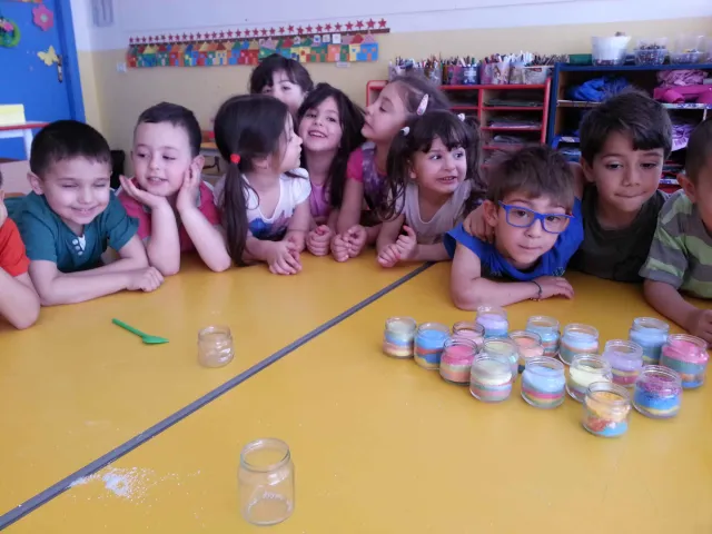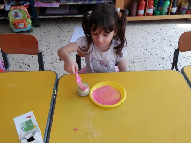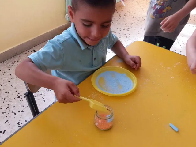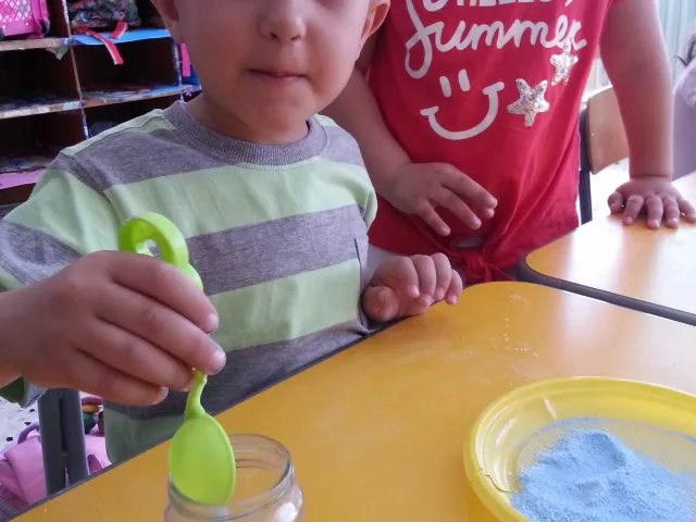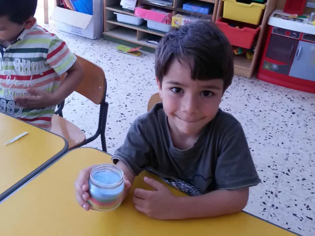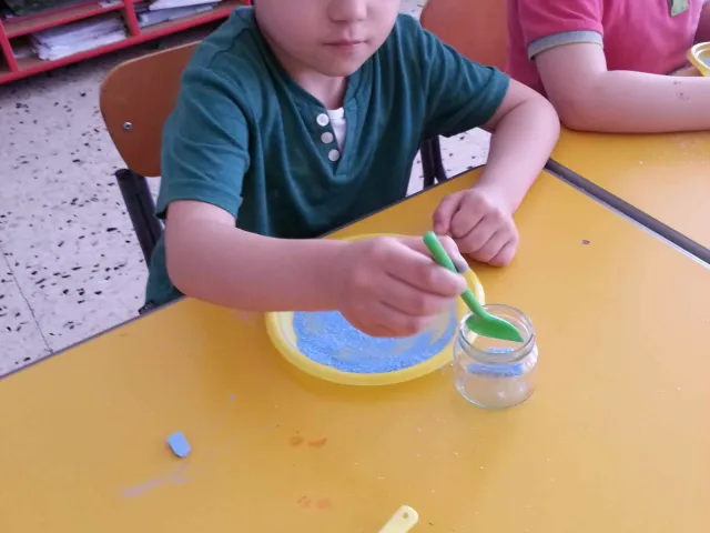 I bambini della II B si divertono a creare vasetti di sale colorato secondo una tecnica semplice e divertente